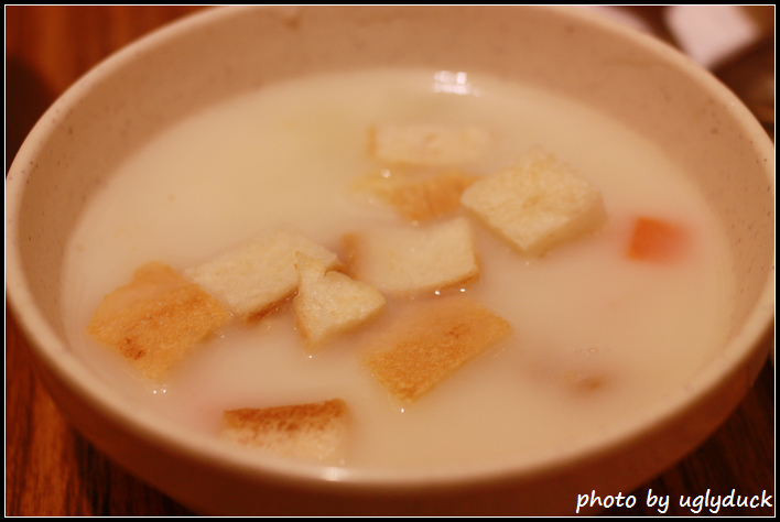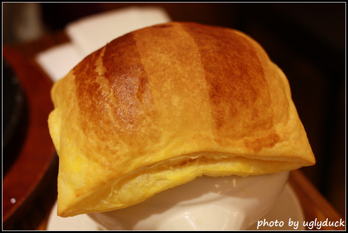 嚇了一跳, 因為吃完排餐後服務人員送上了酥皮濃湯~ 有點顛倒了, 我以為濃湯就是無限供應的部份, 裡頭的東西是一樣的, 只是多了一層酥皮在上頭, 如果知道這是另外的我就不會再自己舀湯了, 雖然說是有賺到的感覺, 但是澳客炙燒牛排的份量夠多, 再喝完這碗湯真的有撐到哩