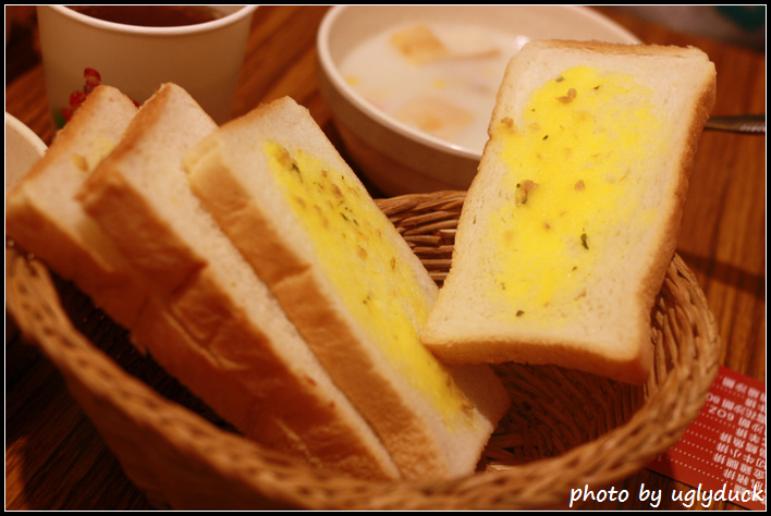 大蒜麵包的部份店家已事先備好兩片一組, 中間塗上蒜醬, 在經過烤爐就可食用, 不管是單片 or 雙片合用都不錯呢