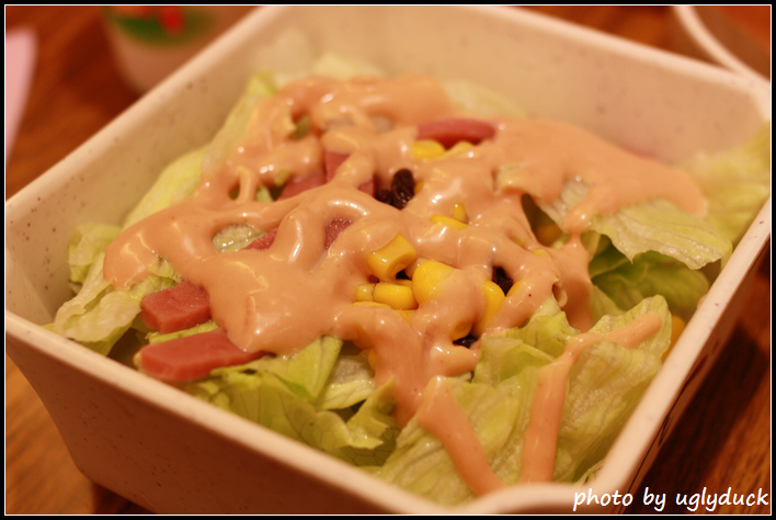 沙拉比較簡單, 就生菜上放有火腿片及玉米粒. 葡萄乾, 再淋上美奶滋