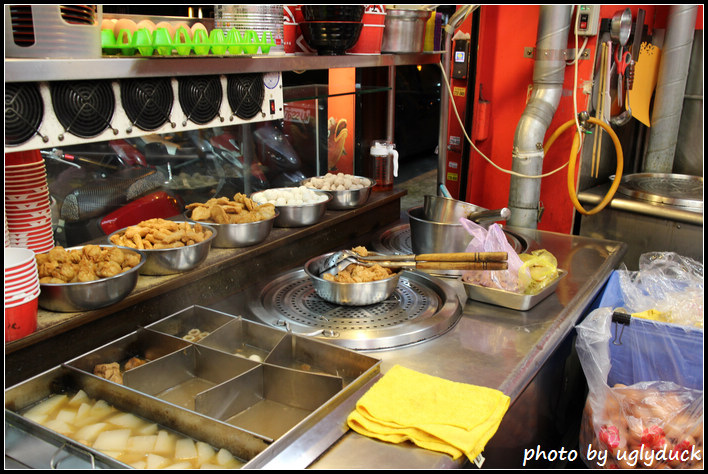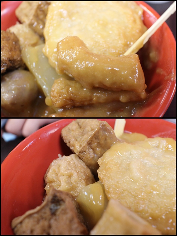 因為湯頭好, 所以煮出來的甜不辣有吸附一些湯汁味道就很不錯, 另人感到特別的是豆腐, 看起來它是有事先被處理過 (炸 or 煎), 表面已經有豆乾的感覺較為硬, 裡頭還是原來豆腐的口感, 一咬下除了內部爆漿的湯頭, 豆腐與柴魚高湯的結合是非常完美的, 雖然說今天這一攤主角是甜不辣, 不過我會把票投給豆腐耶