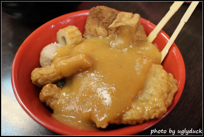 大碗的甜不辣看起來就相當豐富, 不過甜不辣可能到處的差不多, 醬的學問就會影響口感, 吉甜不辣的醬帶些微辣, 完全不吃辣的人會較明顯的感覺出來, 不過在吃的時候這個辣的感覺會在刺激味覺的反應過後消失在咀嚼之間, 倒是不會造成任何的困擾, 反而真有開胃的效果