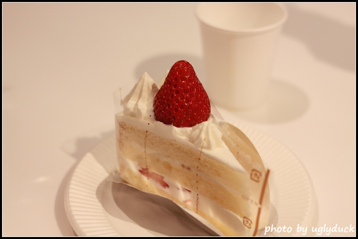 這一塊草莓蛋糕要 190 円, 不過上頭跟裡面都各有一顆完整的草莓, 我覺得誠意真的很夠了, 配上鬆軟的海綿蛋糕, 加上甜又不會太膩的鮮奶油, 這個蛋糕非常的好吃