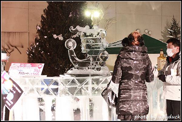 飯店的門口設了一個飲酒的攤位, 吧檯就用冰塊架起來的, 還真有人來捧場呢