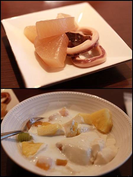 來一碗自己搭配的水果優格, 然後再接著一碗蘿蔔墨魚煮 (冷), 意外的, 並沒有很噁心的感覺