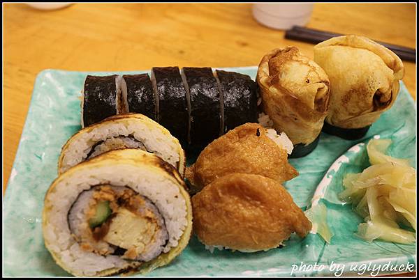 不過最讓人驚豔的是這道綜合壽司, 才 NT$130 元而已, 除了兩個豆皮壽司 (底部沾滿黑白芝麻), 最特別的是圖片右上角的壽司, 因為形狀很特殊我家公主還叫它是天燈壽司, 外皮包覆的是蛋皮, 底下以海苔封口, 裡頭雖然和其他花壽司差不多, 不過醬似乎不太一樣, 就是覺得好吃