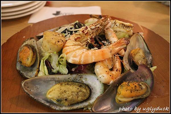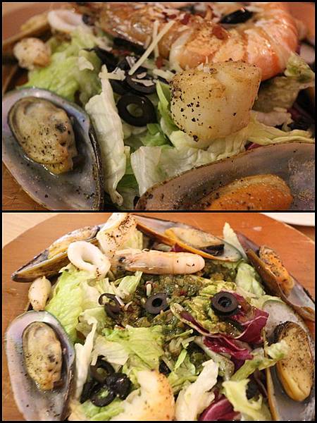 再回頭看一下菜名, 果真如此一道 "暖" 沙拉吃起來真過癮, 淡菜. 蝦子. 干貝. 花枝等海鮮陳列其上, 底下有生菜. 橄欖及青醬, 不只是菜暖, 吃完心也暖了說~~~
