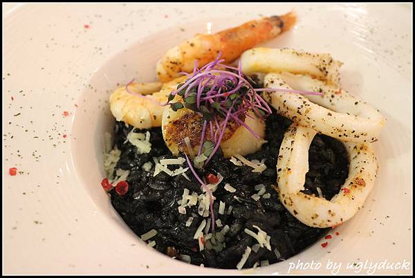 燉飯每一顆都裹有墨魚汁, 吃起來是比較顆粒感的米飯而墨魚汁有經過處理調味, 整個在嘴裡咀嚼有著香甜味, 就算是冷掉了也還相當的好吃, 就可惜份量來說分食的話會覺得不太夠了~ 總是會覺得一個人吃都怕不夠呢~