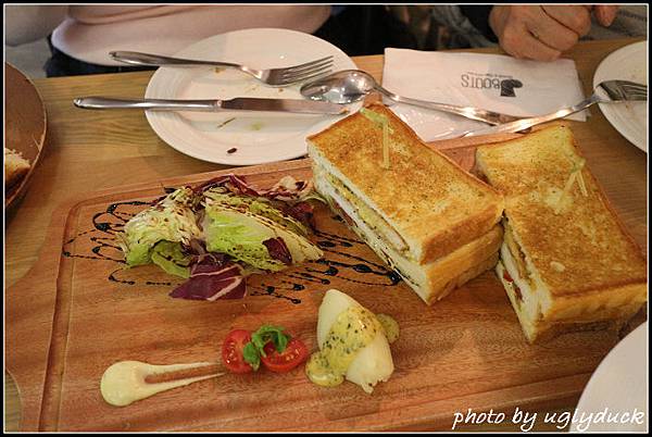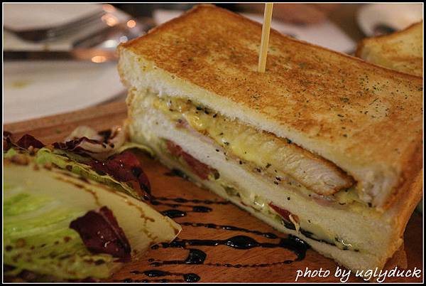 另外我們自己還點了非體驗之外的餐, 壓烤帕里尼的 "匈牙利碳烤豬排", 說是帕里尼但用的是一般的吐司麵包做的, 不同於牛排的三明治麵包只是稍烤一下, 帕里尼的土司烤的更為焦香一些