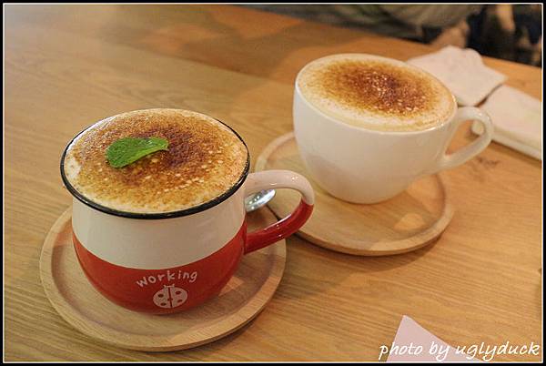先說說上層的焦糖, 我看他們是將奶泡鋪滿杯子後再灑上糖, 然後直接噴槍把糖烤到呈焦狀, 所以上桌時的焦糖香味會第一個接觸到, 伯爵鮮奶茶有一股特別的香氣, 溫熱的喝相當好喝, 而黑糖歐蕾基本上就是黑糖熱牛奶, 低溫的夜裡來上一杯溫暖人心啊~~~