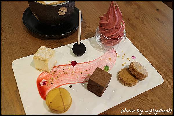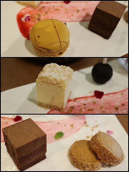 手工餅乾的部份有巧克力蛋糕. 驕糖口味馬卡龍, 手工餅乾以及裡頭是百香果軟糖(同前面香菇上的軟糖)裹以巧克力的棒棒糖, 起司蛋糕由原先較冰凍的硬狀態, 到稍回到常溫的細緻口感, 口感的轉變也不損其味道, 做為下午茶的搭配, 相當的有貴族氣息