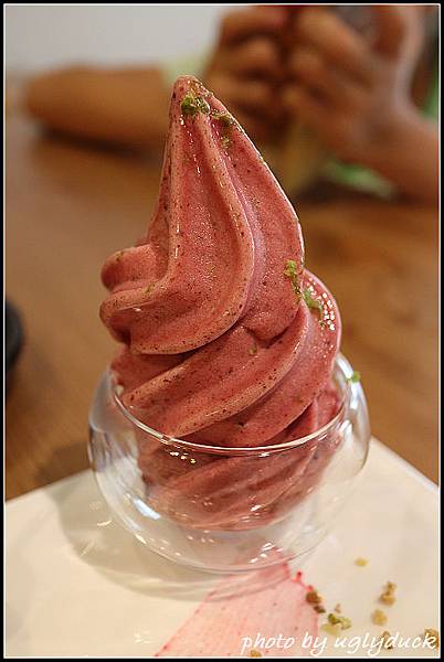 運氣真不錯, 今日霜淇淋是檸檬莓果口味, 上頭綠色的是現磨的檸檬皮, 看起來完全是莓果的顏色, 但吃起來卻有著濃郁的檸檬味, 但酸味已經被莓果沖淡, 所以就算怕酸的人吃來也不會有那麼刺激的酸味, 老闆娘的手工水果冰淇淋因為是很實在天然的水果, 所以那種順口的感覺是相當的舒服, 恍惚間還可能忘記是在吃冰而不是直接吃水果本身, 所謂天然食材的表現一點也不為過