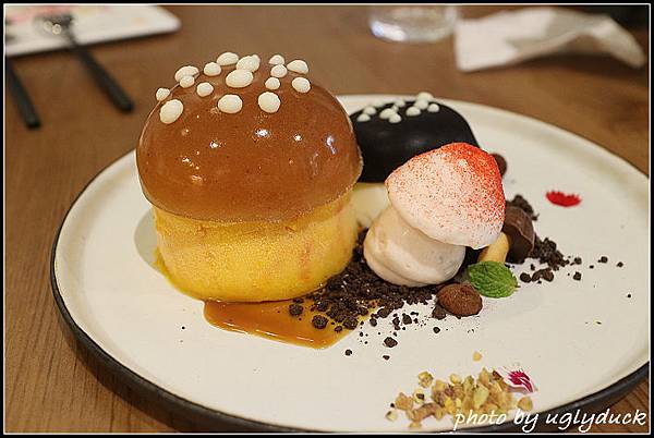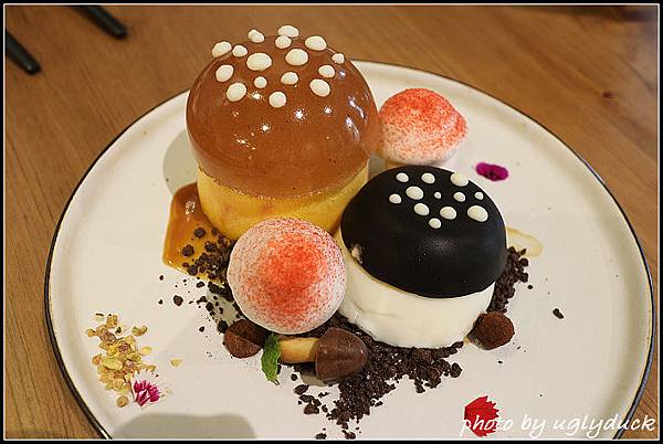 兩朵紅白色的香菇是加入了紅心芭樂的蛋白糖霜, 利用在地水果做的蛋白糖霜, 沒有甜而膩的感覺, 取而代之的是滿口的紅心芭樂香氣, 讓人覺得這一盤的主角非它莫屬