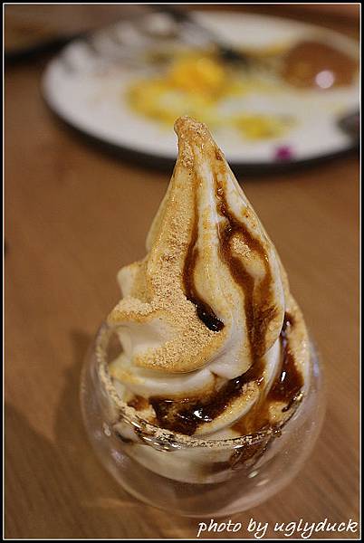 今日的豆乳霜淇淋絕對是個亮點, 甚至我覺得也是賣點, 以豆乳做成的霜淇淋少了很多黃豆的特殊味道, 可能也是因此是冰的關係, 我想不愛喝豆漿的人也能夠接受, 撒上了黃豆粉及佐以黑糖蜜, 順口的感覺比純鮮奶做的霜淇淋還要讓人覺得驚豔, 其中又有台灣的特色在, 做為商品的推廣我覺得很不錯哩