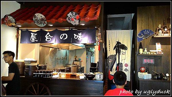 店內料理櫃檯做成九州的屋台樣式, 強調它的正統性, 左邊自助式茶水, 右邊則提供各式自行添加的調味臺