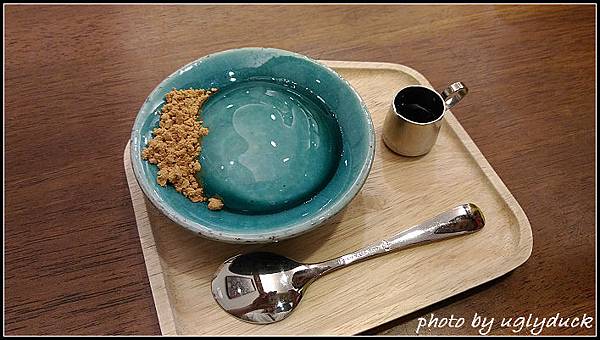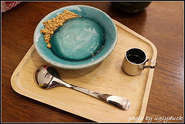 淡藍色的碗相當的好看, 裡頭有個半球形透明的果凍, 搭配黑須黃豆粉並淋上波照間黑糖, 就是一個道地的水信玄餅