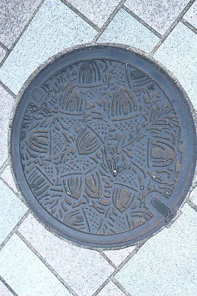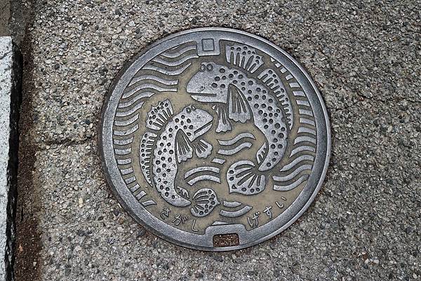 這次在九州, 看到的水溝蓋都沒有什麼特別圖案, 直到最後一天在柳町的長崎街道時, 才看到彈塗魚的水溝蓋, 彈塗魚似乎也是這邊的名物, 所以才有機會登上水溝蓋吧, 呵