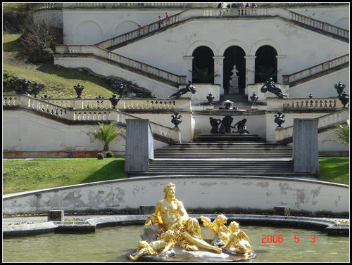 不同於德國城堡的設計, 此一宮殿是以凡爾賽宮為仿效對象造出的, 也是路德維希二世所建造的三個神話城堡之一 (新天鵝堡 (Schloss Neuschwanstein). 林德霍夫堡 Linderhof). 基姆湖堡 (Herreninsel Castle)), 這個地區非常寬闊, 後面就是山, 且四周圍是看不到其他任何建物的 (照片中間遠方的綠色涼亭是俯瞰整個區域的相對制高點, 此照是從另一頭石階平台高點拍攝)