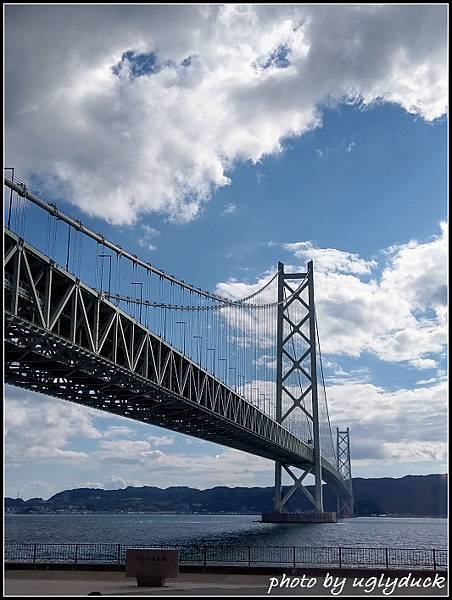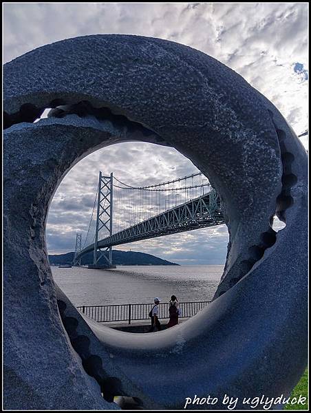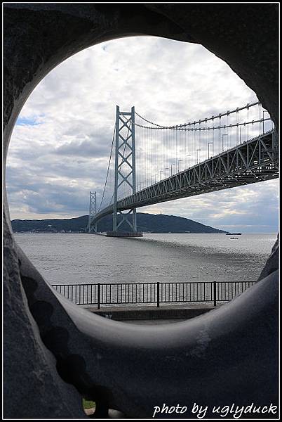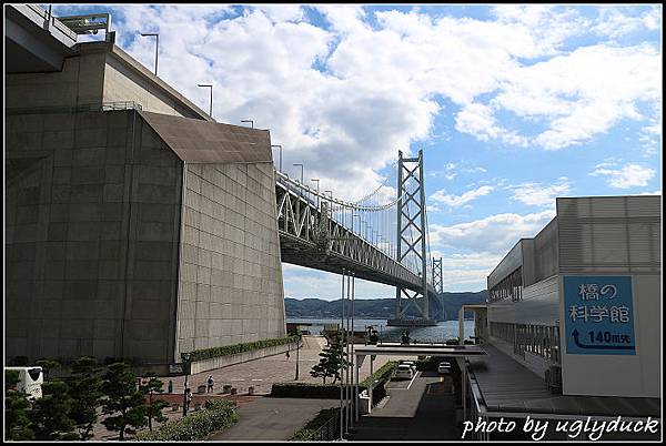離開橋的科學館先來拍拍壯觀的明石大橋, 明石大橋是世界第一長的跨海大橋, 橋的設計分為上下兩層, 上層是一般行車, 下層則是規劃給鐵路使用, 只是目前尚未有鐵路的運輸往淡路島, 這條交通路線也是從本州往四國的道路, 不可謂不重要啊, 淡路島的另外一頭就是有名的鳴門海峽 (漩渦), 下次就要從另一端去看看了