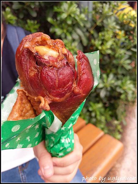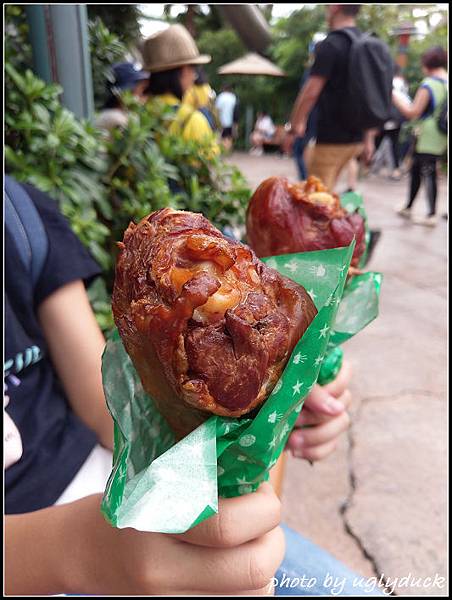 要介紹這隻火雞腿肉, 是個人覺得一定要吃的東西, 園區的餐食都不便宜, 這隻大腿也是一樣, 不過火雞腿很大隻感覺就比較划算, 但火雞肉應該是比較乾柴的, 幸好這支燻烤雞腿真的處理的很不錯, 醬汁入味, 吃起來也夠軟爛, 一般食量的人吃一隻就可以有飽足感