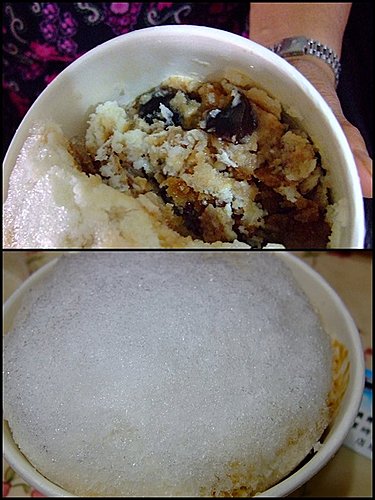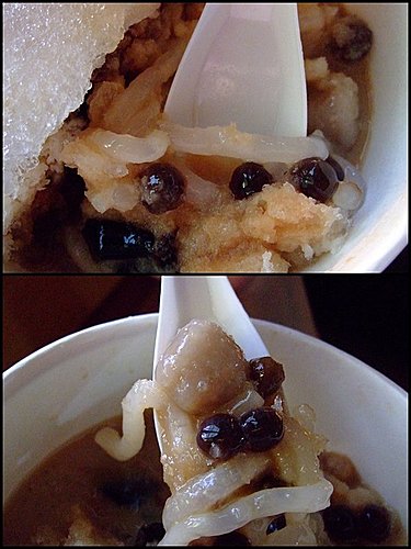裡頭的料也是很多選擇, 這一碗有煉乳. 粉條. 粉圓. 芋圓. 仙草一共五樣. 淋上招牌黑砂糖水, 整碗都是香甜的感覺, 一個人吃一大碗還有點辛苦, 很適合小倆口妳一口我一口的吃, 原來夏天不只冰冰涼涼, 還有甜甜蜜蜜呢!