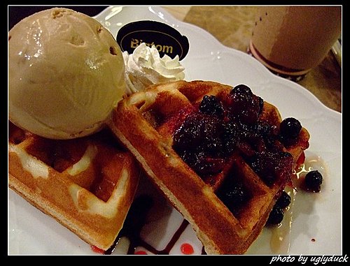 這是套餐系列, 小鬆餅+單球(藍姆櫻桃)+飲料, 鬆餅真的小, 但還不錯吃, 鬆餅加冰淇淋一起吃也很特別