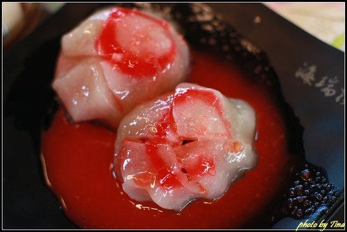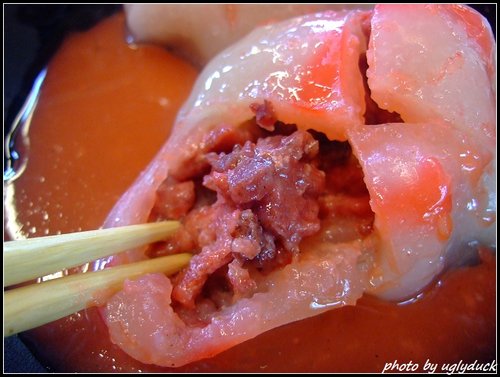 紅糟肉圓比較小巧可愛型, 醬是屬於比較清淡味的, 外表米漿的外皮頗 Q 彈, 內餡的紅糟肉是瘦肉, 雖淡淡的但有入味, 裡頭還吃得到一顆栗子喔