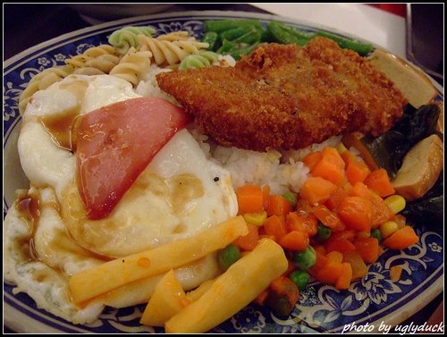 我點了餐蛋火腿香酥鱈魚扒飯, 奇妙的是竟然還看到螺旋義大利麵... 配菜還滿豐富的, 只是仔細看起來, 都是比較一般的食材, 荷包蛋. 火腿不說, 尚有幾根筍絲. 豆乾. 海帶. 四季豆. 紅蘿蔔丁+玉米粒+豆子, 吃飽是沒問題的, 但要說是美味的話可能還是差了一些些~