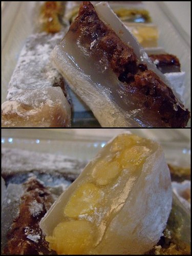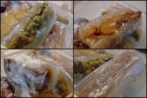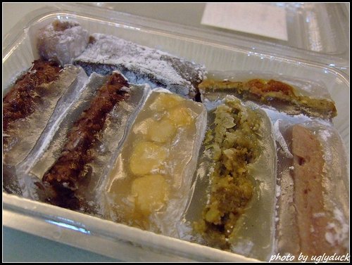 我自己是比較喜歡吃黑糖 (圖左下) 口味, 就和屏東的 "雙糕潤" 很像 (或許就是一樣吧), 其他的口味就是品嚐到內餡被熬煮的綿密的口感, 這涼糕放進冰箱冰鎮, 在食用時的確感到一股涼意, 達到消暑的目的呢