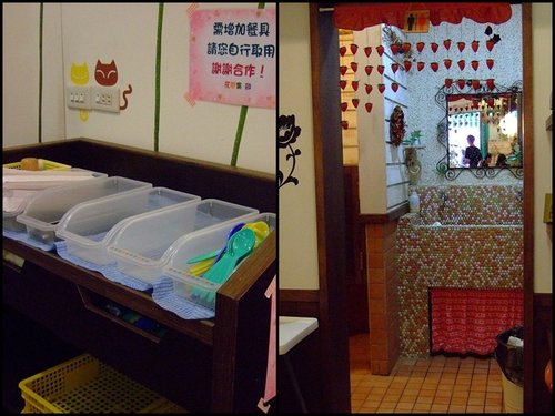 點餐點的地方在外頭, 所以需要的餐具可自行取用, 廁所用了馬賽克磁磚, 也整理得很乾淨