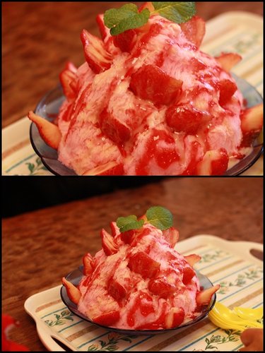 將將~ 這就是當季草莓的草莓雪花冰了, 看上去的顏色以及草莓的大小, 在在令人口水直流啊~ 加上草莓口味的雪花冰並淋上煉乳, 真個甜死人不償命啊! 在濃濃的奶香下, 這雙人份量的雪花冰逼下子就被解決了呢! 人多的話還可以點 8 人份量的巨無霸 (真挺壯觀的說)