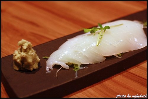 函館名物烏賊細切生魚片 (NT$250), 芥末泥是現磨的, 有點特別, 單吃的時後會有嗆辣感, 沾到醬油配合食材入口又隱身在食材之後達到襯托的效果, 烏賊挺新鮮的, 細切的工夫很厲害, 就像麵條般細, Q 彈的口感帶上烏賊的一些黏稠感, 我覺得當開胃小點很棒 (太奓侈)