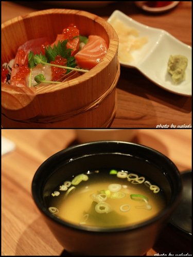 豪快. 海鮮丼 (NT$520), 是用小木桶裝著, 還附上一碗味噌湯, 另附上現磨芥末泥及漬生薑片, 味噌湯的味道不同一般喝到的, 卻又說不出個所以然... 不過味噌的口味太多我本也就認不太清楚了
