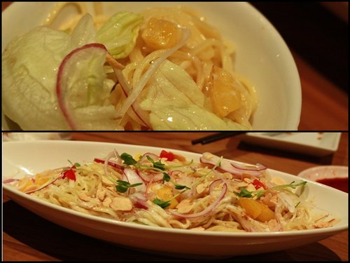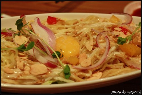 拉麵加上蒜酥後與原本的沙拉混在一起成了一道涼麵, 醬則是和風沙拉醬, 吃起來相當的清爽宜人, 也讓人想不到沙拉與拉麵可以這麼合, 中間的生蛋黃與和風醬是個要角, 把這兩種性質不同的東西拉得靠近一起!