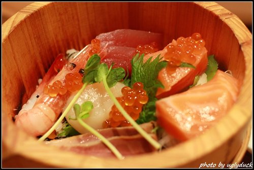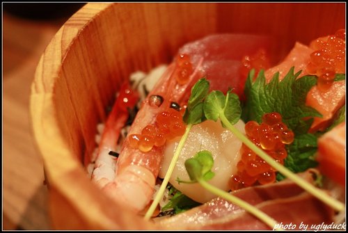 雖說品名有豪邁爽快的意思, 不過實品似乎沒有那麼大的震撼力, 第一: 木桶裡的白飯份量太多了... (不過後來也好險夠多, 拿來配鮭魚卵; 第二: 這飯竟然不是醋飯, 使我只好將芥末混合醬油後淋到木桶中的吃法嘍