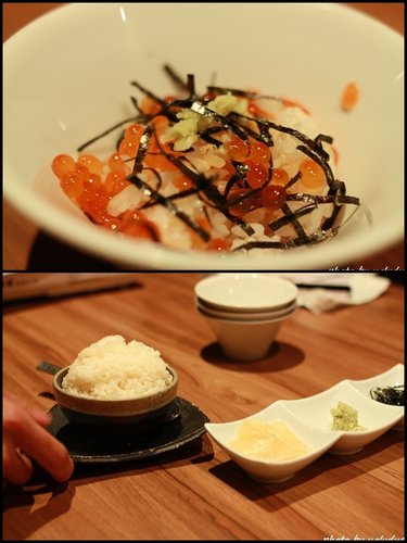 今晚的重頭戲來了, 北海道直送鮭魚卵飯 (NT$680), 首先服務生送上一個添上小山高般的白飯以及有生薑片. 芥末泥. 海苔絲, 接著說明 "遊戲規則", "當店員開使以湯匙挖取鮭魚卵進入碗裡時, 身為客人的我們要跟著店員喊 "Wa Shaw"", 跟著喊的狀況就是店內其他人會好奇的看過來, 此時不要在意他人的目光, 跟著喊就對了