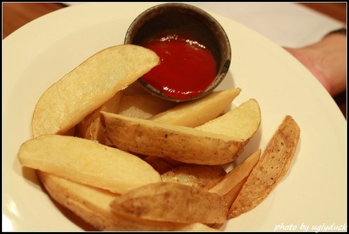 北海道 薯條 (NT$120), 是有些小貴, 不過就聽說北海道的馬鈴薯有名嘛~ 這邊是用厚切的方式, 煎完上桌很燙, 口感則是馬鈴薯不似一般的乾 (畢竟不是炸), 鬆軟中似乎又有原本的爽脆, 稱不上如何特別的好吃... 或許北海道奶油馬鈴薯會比較好吃有特色些
