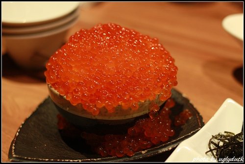 幾輪下來, 這一碗的鮭魚卵就像 candy crush般在碗上. 盤上滾動著... 多麼令人興奮畫面, 這邊的鮭魚卵不像很多地方看到像大顆珍珠, 反而是比較小巧型的, 不過味道還不錯, 雖說單吃頗鹹, 但只要搭配白飯就挺 ok 的, 這麼一碗吃起來也麻煩, 所以先舀上部份鮭魚卵以及白飯到另外的小碗上, 再撒上海苔絲. 加上些許芥末泥. 淋上昆布醬油 (如上圖), 就是一碗碗的鮭魚飯喔~ 兩人點一碗會吃得相當過癮啊!
