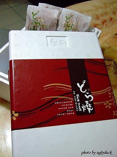 前一陣子造成很大炫風的這一款銅鑼燒, 小姨子利用提早下班的機會去買了回來, 整個以保麗龍盒包裝, 裡頭則是整齊擺放著各種口味單個包裝的銅鑼燒, 底層放上幫助冷藏的冷凍袋, 看上去相當清爽, 也相對提升點心的等級, 而且不會有過度包裝的感覺, 保麗龍盒還有冷凍袋都可以重覆再利用; 裡頭還是一張小卡有店內產品資訊等等, 以及建議從冰箱拿出退冰 10 分鐘再食用更得其風味
