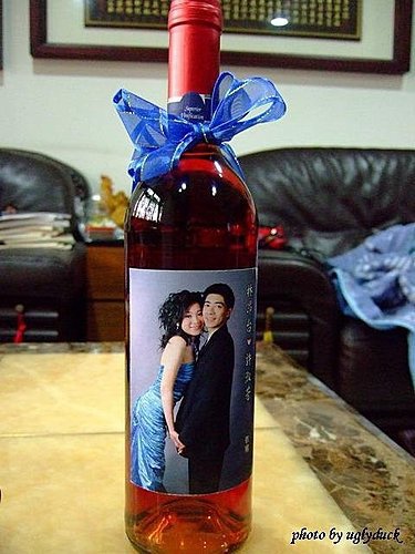 這瓶酒名字是 "玫瑰" 因為其酒色不似一般紅酒班暗紅, 而是較淡, 倒入杯中透著點淡淡粉色, 光是視覺上就讓人覺得舒服, 實際喝起來也可感覺到其甜味, 不愛喝酒的人不會有太大的排斥心裡; 找到這瓶酒時就決定要用她, 而為了讓這瓶酒有新的意義, 我跟老婆精心從婚紗照中找到一張適合這酒的 style, 然後在去找印刷廠幫我印成不會碰水就褪色的貼紙, 將其貼在酒的背面保正面有 "玫瑰" 字樣的酒標, 最後再在瓶身上頭封口處附近綁上跟婚紗照一樣籃色的緞帶